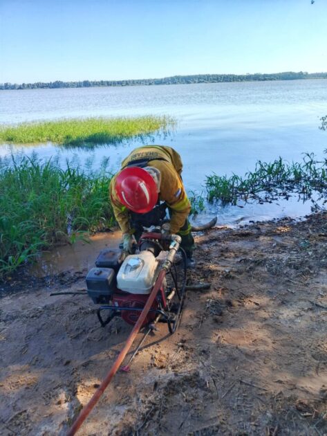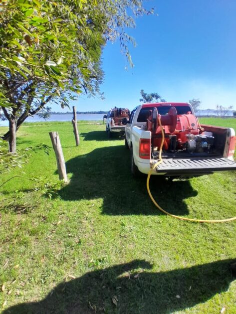 Los voluntarios procedieron a combatir el fuego con una línea de una pulgada, abastecida en forma directa con una motobomba que obtenía el recurso hídrico del lago de Salto Grande.