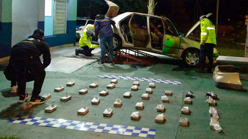 Aquella tarde iban en un auto Peugeot 306 con 36,092 kilos de cocaína, distribuidos en 35 que se hallaban ocultos dentro de un espacio ubicado debajo del baúl del automóvil. Fueron descubiertos por los policías camineros apostado en el kilómetro 341 de la ruta nacional 14. El perro marcó la presencia de drogas en la parte del baúl y no tardaron en encontrar los ladrillos de cocaína.