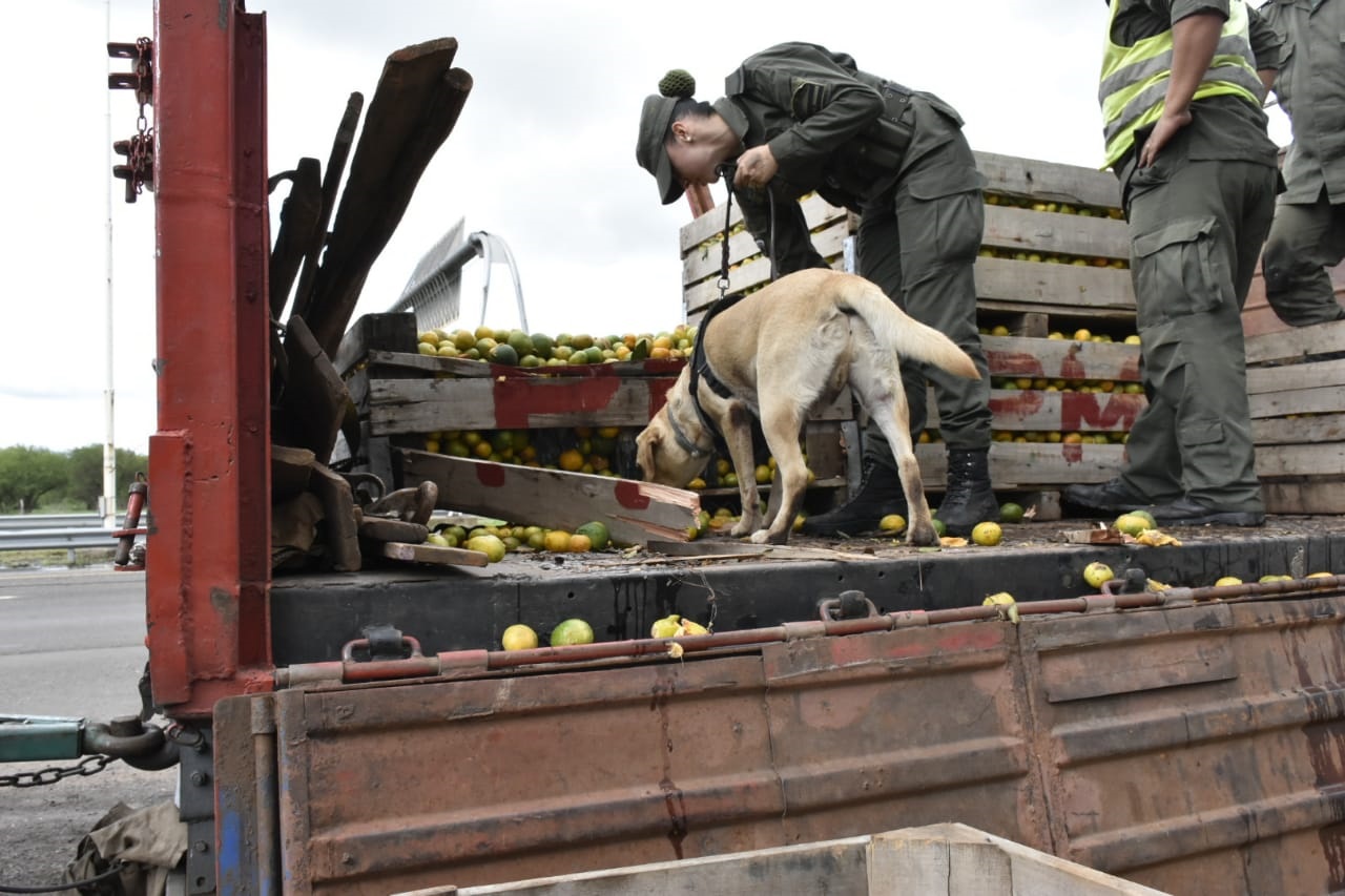 Con el perro detector de drogas confirmaron las sospechas, pero no imaginaban la cantidad de droga que iban a encontrar: fueron en total 1.857 kilos de marihuana, distribuidos en 94 bultos, que estaban entre decenas de bines de mandarinas. Se trató del tercer mayor cargamento de marihuana detectado en la historia en Entre Ríos.