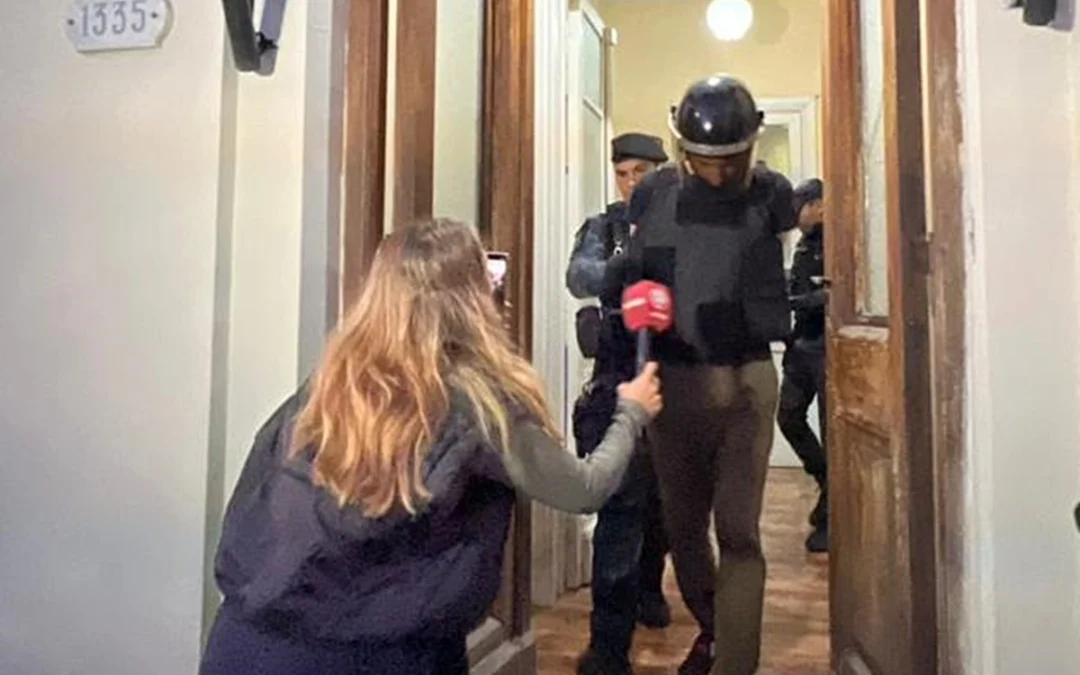 La imagen captada en las primeras horas de la mañana refleja el momento en que Pablo Laurta era retirado de la Jefatura Departamental de Gualeguaychú, custodiado por efectivos policiales y cubierto con un chaleco antibalas y casco protector.