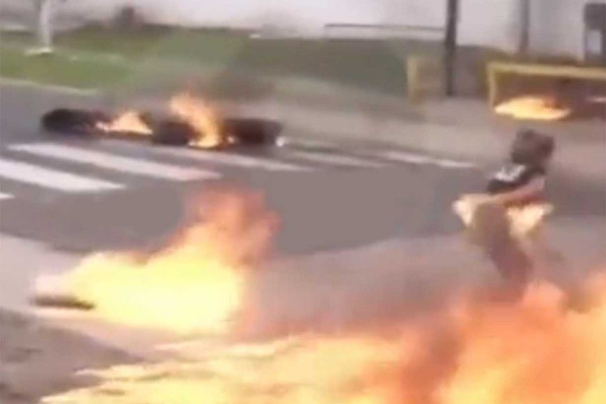 De acuerdo con imágenes captadas en el lugar, un hombre y una mujer se incendiaron accidentalmente mientras alimentaban el fuego de neumáticos incendiados. Aunque pudieron apartarse a tiempo, parte de su ropa quedó en llamas.