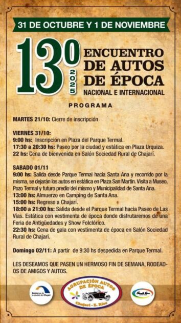 Este sábado 1 de noviembre las actividades comenzarán a las 9 horas saliendo desde el complejo termal chajariense rumbo a la localidad de Santa Ana, dando un recorrido por sus calles y dejando los autos en exposición en la plaza San Martín. Los participantes realizarán una visita guiada por distintos puntos de la ciudad: el Museo, pozo termal y edificio municipal. A las 13 horas se brindará un almuerzo en camping de Santa Ana, regresando a las 15 horas a Chajarí.