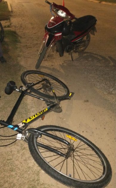 La colisión se produjo entre una motocicleta -marca Gilera, modelo Smash-, conducida por una joven de 28 años, y una bicicleta al mando de un menor de edad, quienes transitaban por Irigoyen, en mismo sentido de circulación.