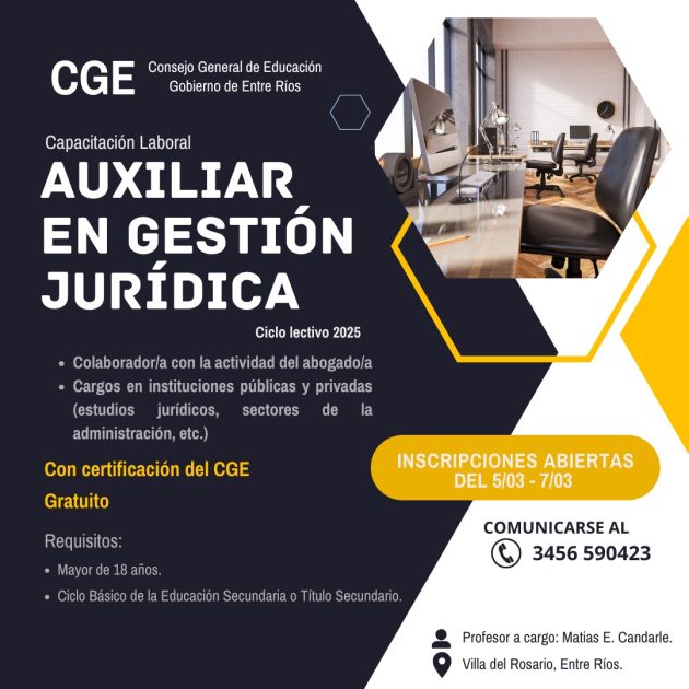 Por otro lado, el Curso de Auxiliar en Gestión Jurídica será dictado por Matías Candarle. Para anotarse, pueden dirigirse a Subsede Departamental Chajarí o comunicarse al 3456590423. Requisitos: ser mayor de 18 años y haber cursado el Ciclo Básico de Educación secundaria o tener Título Secundario.
