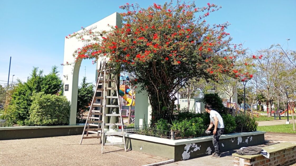 Según se indicó, actualmente se trabaja en el lijado y reparación del revoque de los pórticos de ingreso y de los maceteros de plaza José Manuel Estrada.