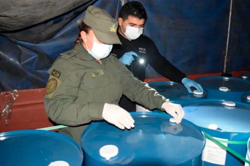 El resultado fue contundente: el primer camión transportaba 95 tambores de color azul y el segundo, 96. Los 191 tambores estaban identificados como «Acetato de Etilo», con un peso de 184 kilos cada uno, lo que arrojó un total de 35.144 kilos de sustancia. El Acetato de Etilo integra la Lista II de precursores químicos establecida por la Ley 26.045, lo que impone estrictos requisitos de habilitación, transporte y registro dado su carácter volátil e inflamable.