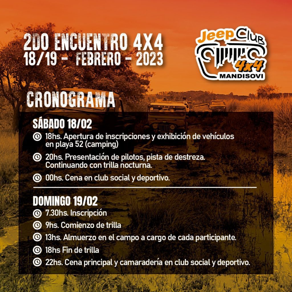 Bajo la organización del Jeep Club 4X4 Mandisoví, en conjunto con la Municipalidad de Santa Ana, el 2° Encuentro 4×4 se llevará adelante el sábado 18 y domingo 19 de febrero.