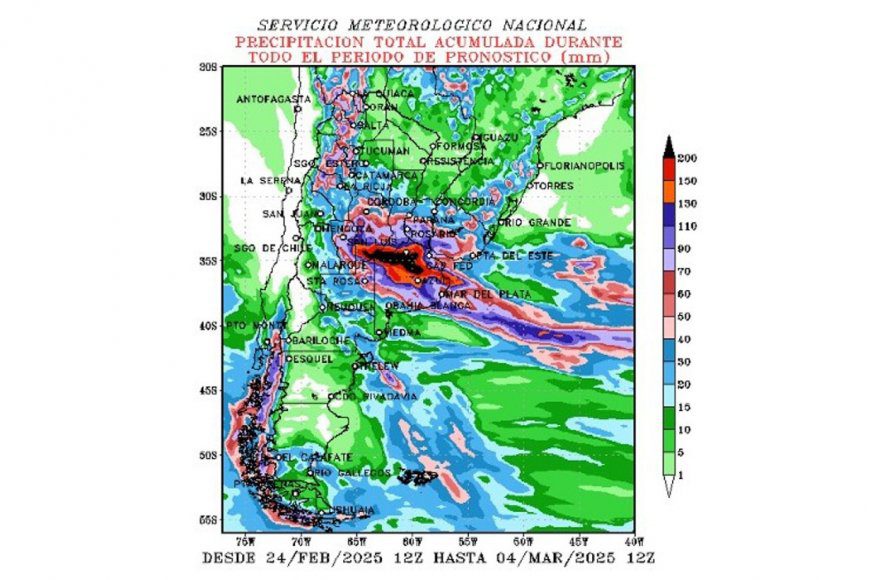 Según el pronóstico oficial, se registran períodos de lluvias y tormentas, los cuales podrán superar los 200 milímetros en forma puntual. A lo largo de este período, el total acumulado de agua podría ubicarse entre los 150 y 300 mm. No obstante, no se descarta que puedan registrarse montos totales que lleguen a los 400 mm.