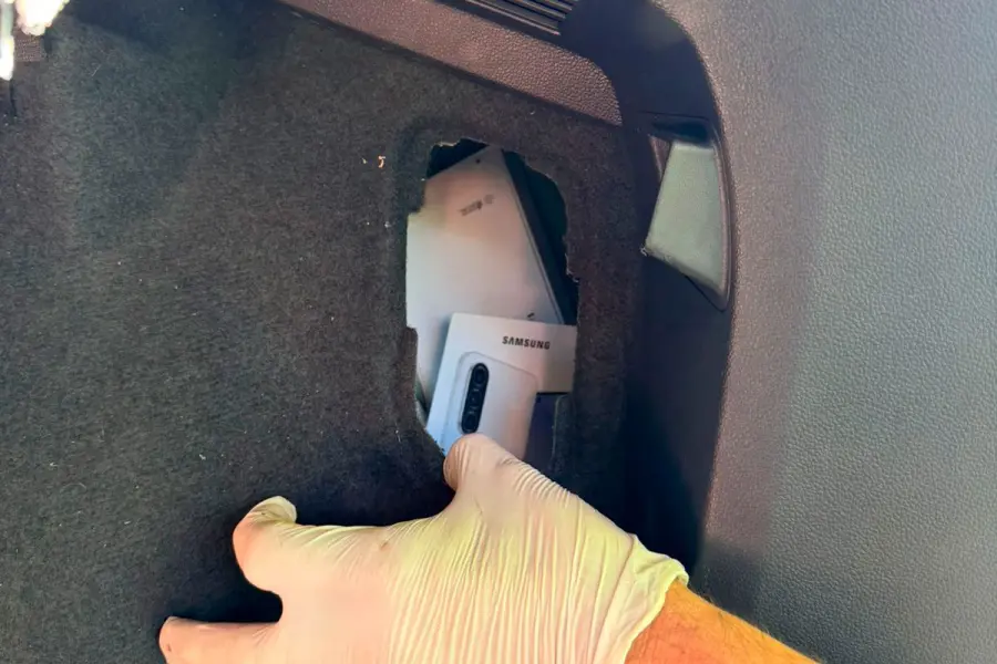Según se informó oficialmente, durante una inspección más exhaustiva, el personal observó que, en el sector del baúl, del lado izquierdo, existía una tapa de la tapicería mal colocada. A través de esa abertura, los funcionarios lograron visualizar teléfonos celulares ocultos en los paneles laterales del baúl, lo que motivó la inmediata intervención judicial.