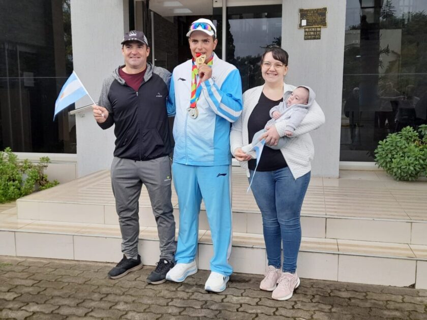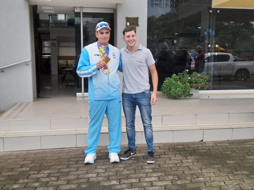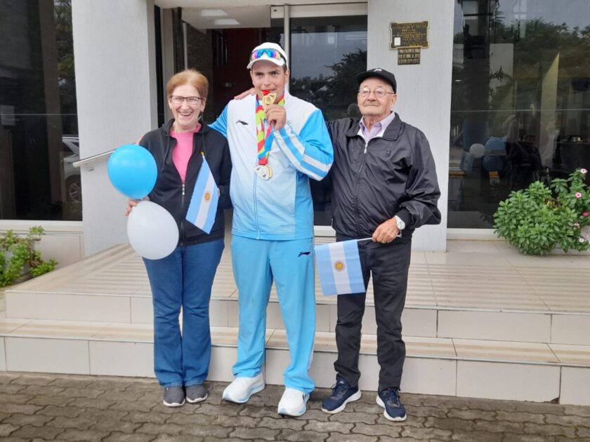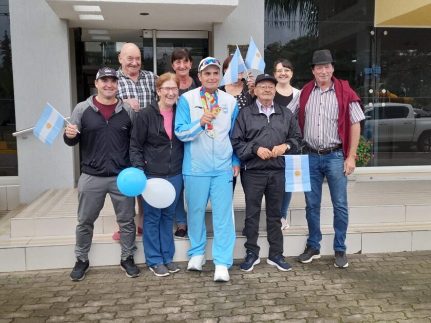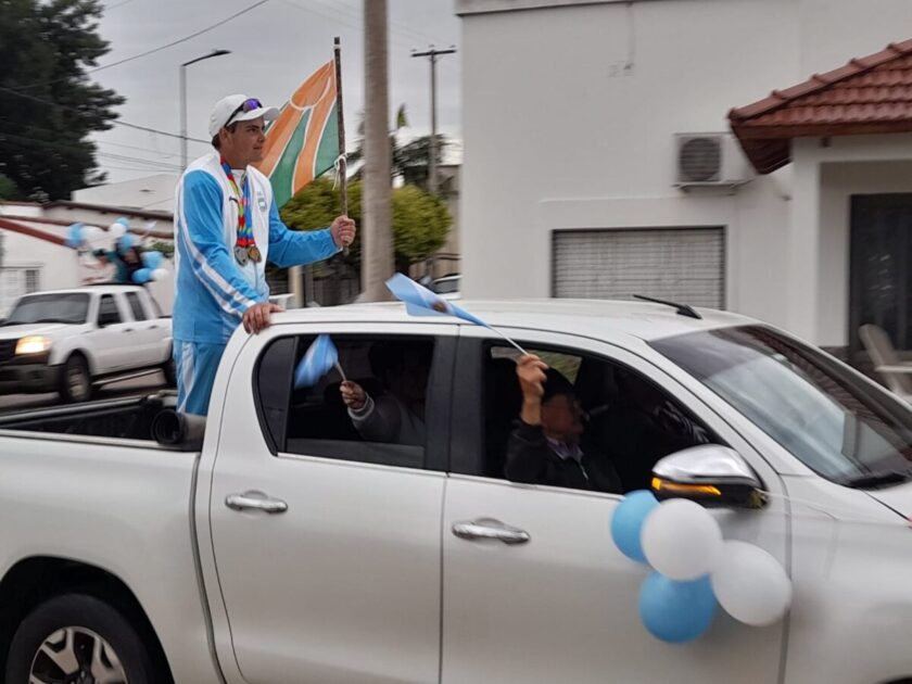 Tras su histórica participación y consagración en los IV Juegos Suramericanos de la Juventud en Panamá, el arquero Gabriel Tonina llegó en la mañana de este lunes a Vila del Rosario. Fue recibido en el arco de entrada, en Av. Presbítero Abecia, y desde allí se realizó una caravana por las calles de la localidad hasta arribar al edificio municipal, donde lo esperaba la intendente Vanina Perini.